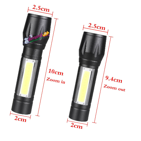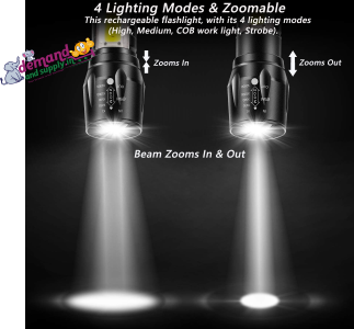 • ADJUSTABLE FOCUS:The flashlights with 3 Modes, XPE , COB and Strobe. The ultra-bright flashlight can zoom in to focus on objects or zoom out to sweep a large area by pulling the flashlight head. The floodlight is used for large area lighting